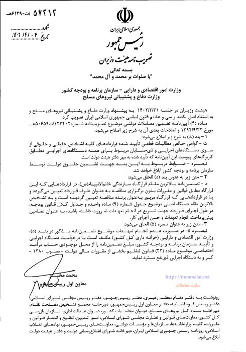 دﺳﺘﻮراﻟﻌﻤﻞ ﺗﺒﺼﺮه ﺑﻨﺪ «ث» اﺻﻼﺣﯽ ﻣﺎده (۴) آﯾﯿﻦﻧﺎﻣﻪ ﺗﻀﻤﯿﻦ ﻣﻌﺎﻣﻼت دوﻟﺘﯽ